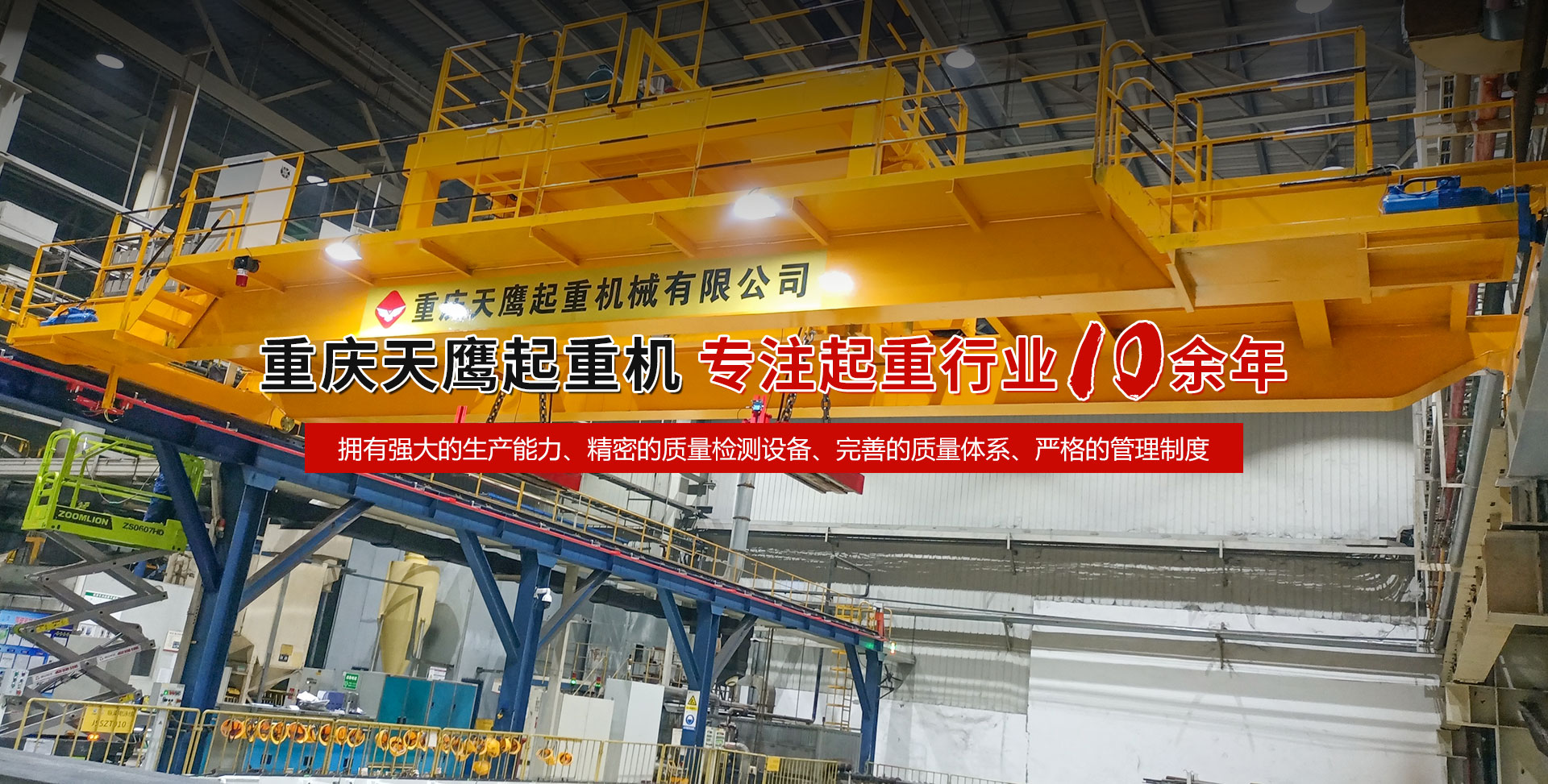 重慶天鷹起重機(jī)械有限公司成立于2014年,主營(yíng)起重機(jī)的銷售、安裝和維護(hù)等相關(guān)服務(wù)。中國(guó)重型機(jī)械工業(yè)協(xié)會(huì)員單位、為中國(guó)工程機(jī)械工業(yè)協(xié)會(huì)工程機(jī)械維修分會(huì)會(huì)員單位及西南地區(qū)起重機(jī)械定點(diǎn)安裝維修單位。具有國(guó)家質(zhì)量監(jiān)督檢疫總局頒發(fā)的特種設(shè)備安裝維修改造質(zhì)格證書。并率先通過了IS09001-2000質(zhì)量體系認(rèn)證。  公司注冊(cè)資金3000萬元;廠房面積2萬平方米;各種生產(chǎn)檢測(cè)設(shè)備50臺(tái)套,公司技術(shù)力量雄厚,聘請(qǐng)了國(guó)內(nèi)知名起重機(jī)專家、工程技術(shù)人員擔(dān)當(dāng)項(xiàng)目經(jīng)理、技術(shù)總工程師及顧問。現(xiàn)擁有員工100多人,其中工程技術(shù)人員12人。  主導(dǎo)產(chǎn)品為各類橋、門式起重機(jī)及輕小型起重設(shè)備,具備生產(chǎn)起重量200t及以下通用橋、門式起重機(jī)的能力,尤其在200t以下起重機(jī)產(chǎn)品上具備較強(qiáng)的市場(chǎng)競(jìng)爭(zhēng)力,為許多行業(yè)設(shè)計(jì)制造了技術(shù)含量高、技術(shù)性強(qiáng)的起重設(shè)備,許多產(chǎn)品在原設(shè)計(jì)標(biāo)準(zhǔn)上進(jìn)行了較大的改進(jìn)、優(yōu)化和創(chuàng)新;其中NH型系列電動(dòng)葫蘆、HD型電動(dòng)單梁處于國(guó)內(nèi)高水平.....  好的產(chǎn)品品質(zhì)需要由較高的裝備水平來保證,公司購(gòu)買了“大型數(shù)控落地鏜”、“數(shù)控切割機(jī)床”、“自調(diào)式焊接滾輪機(jī)”、“數(shù)顯液壓板料折彎?rùn)C(jī)”、“超大型數(shù)控臥式車床”、“數(shù)控液壓水平下調(diào)式三輥卷板機(jī)”、“單柱移動(dòng)式立式車床”“擁有用于單梁生產(chǎn)的全國(guó)一條拋丸噴漆烘干線、葫蘆噴漆烘干線和全國(guó)較大的100T葫蘆試驗(yàn)臺(tái)和檢測(cè)中心”等各種先進(jìn)的加工設(shè)備,新建廠房面積近2萬平方米。  質(zhì)量是企業(yè)的生命,天鷹公司依據(jù)“ISO 9001國(guó)際質(zhì)量管理體系”標(biāo)準(zhǔn),制定并完善了公司的質(zhì)量管理體制。堅(jiān)持質(zhì)量體系的內(nèi)審和外審,將質(zhì)量管理工作落實(shí)到企業(yè)生產(chǎn)經(jīng)營(yíng)的全過程。  您的微笑,是天鷹永恒的追求;天鷹的服務(wù),是您首要的選擇!因?yàn)槲覀儓?jiān)信:“誠(chéng)信是本、質(zhì)量鑄就品牌”。為您服務(wù)是我們的榮耀,勤奮而進(jìn)取的天鷹人,時(shí)刻期盼著您的到來。